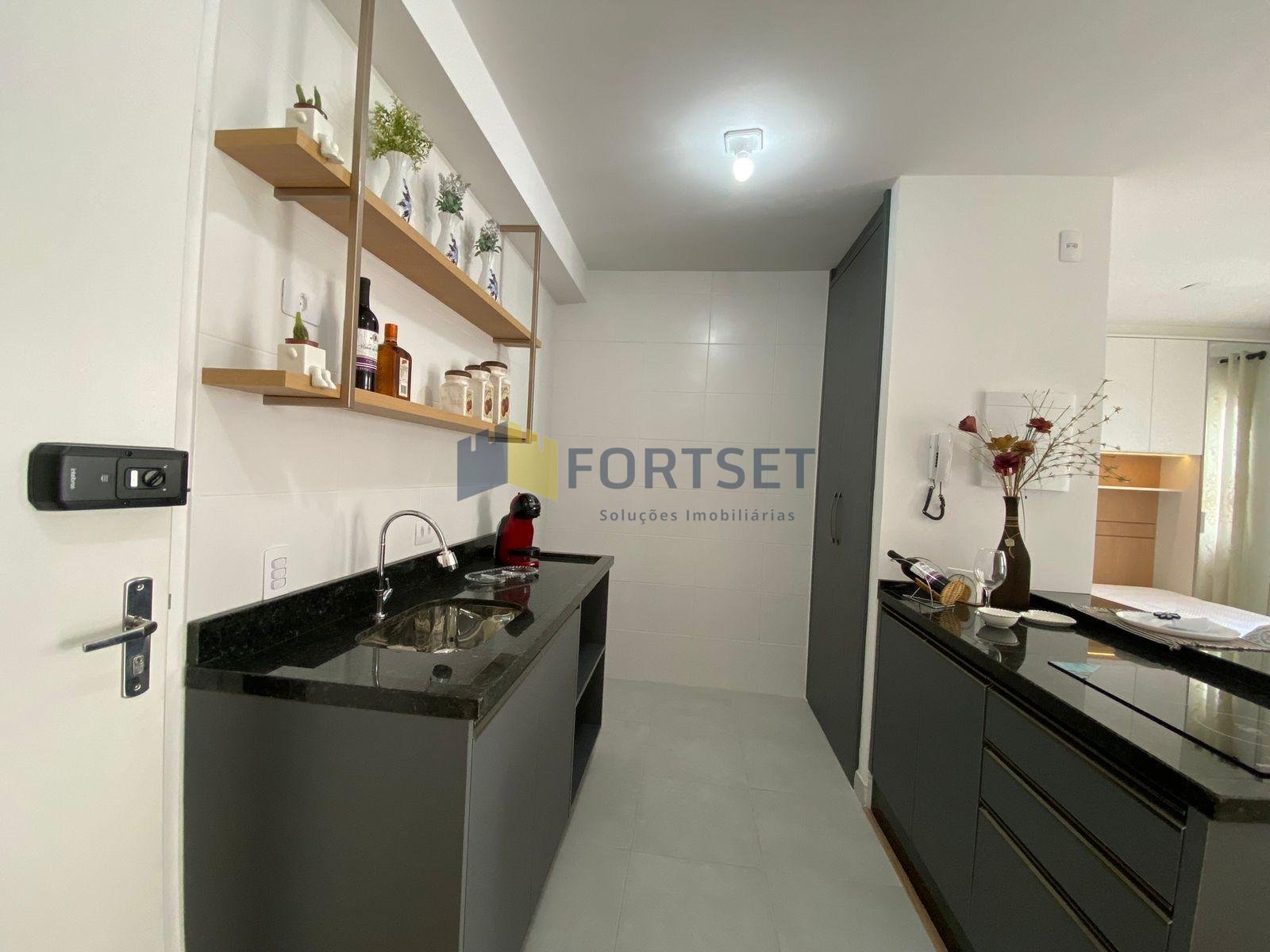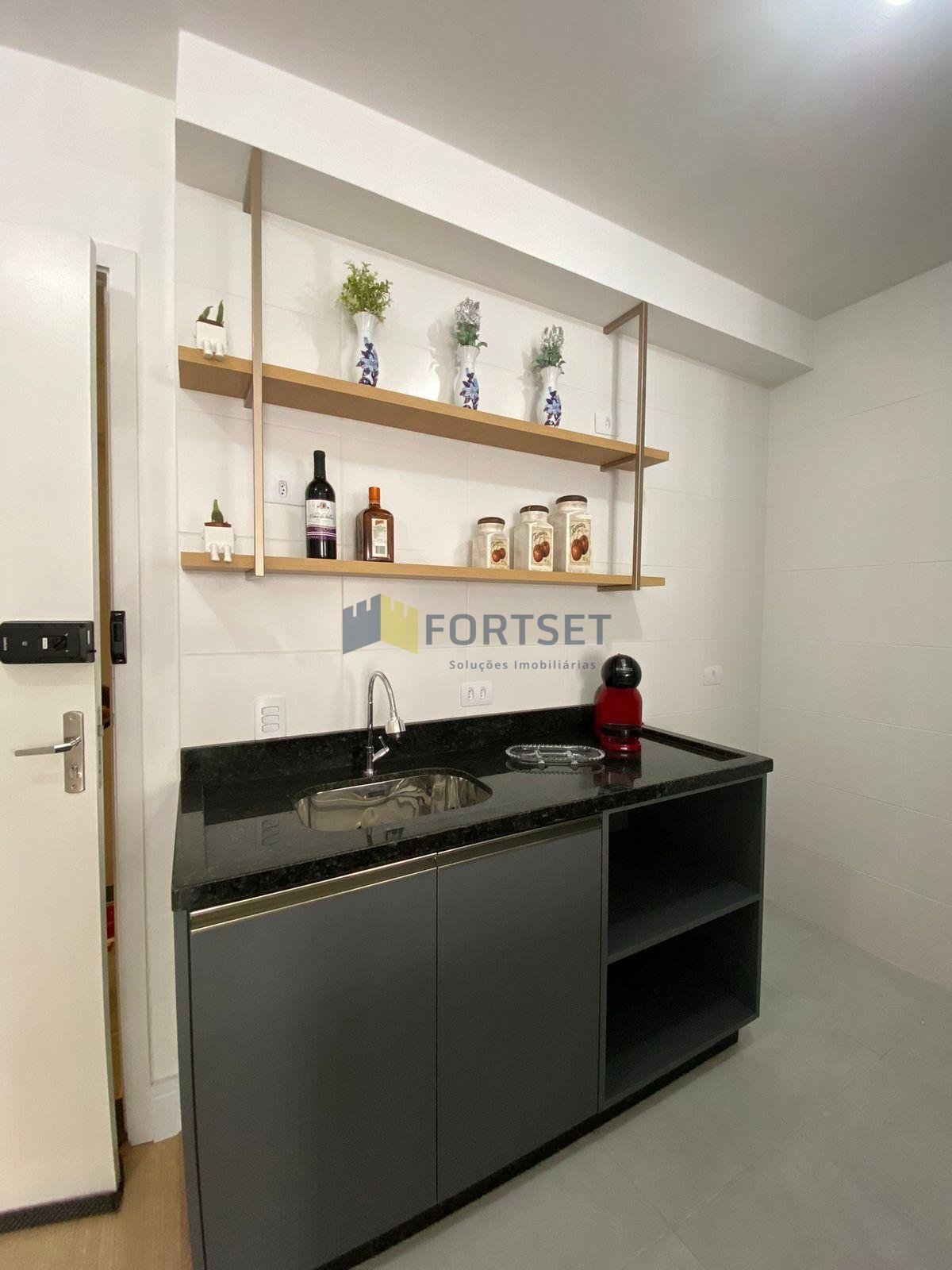 Cozinha montada com armário e pia.