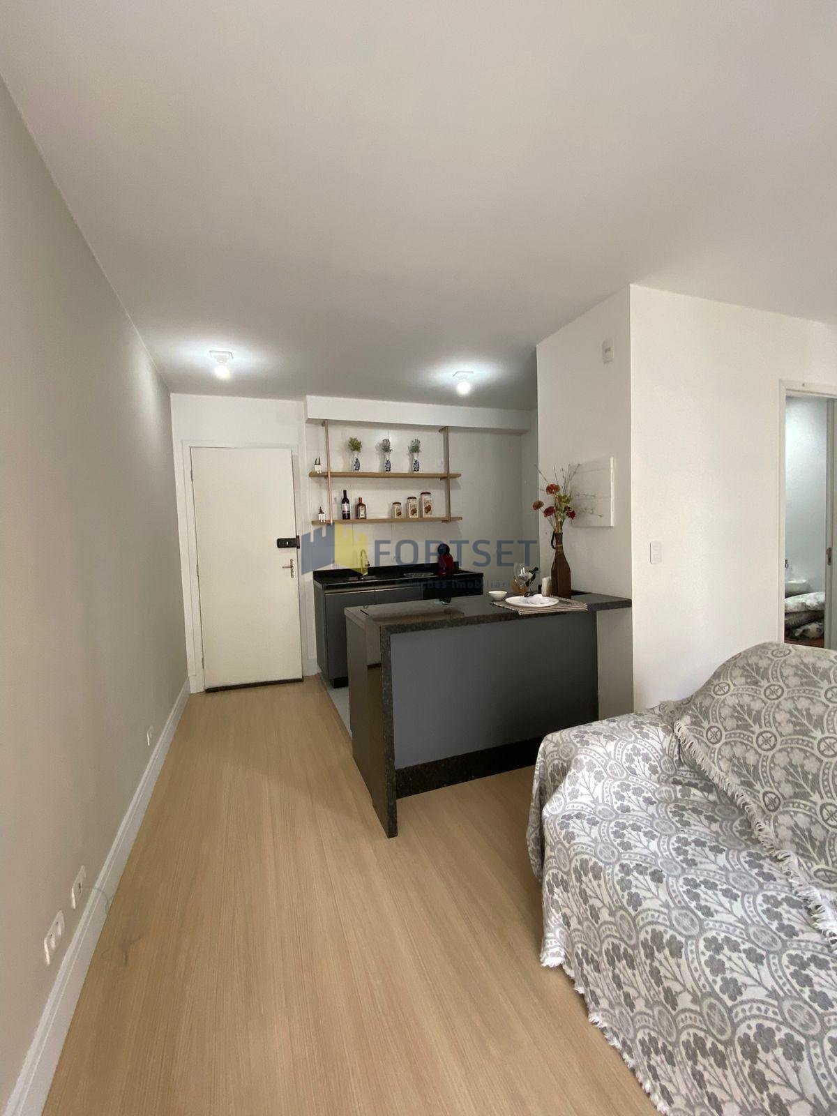 Sala de estar integrada, com sofá.
