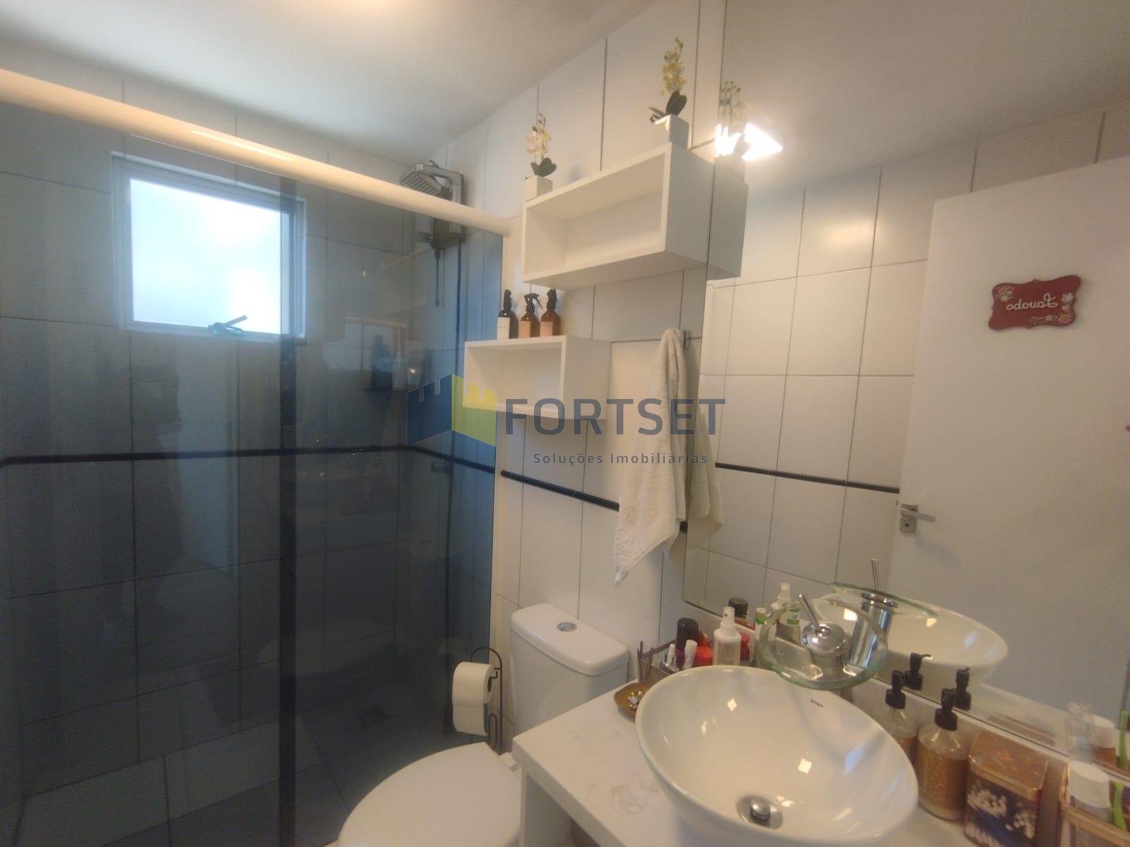 Banheiro social com box em vidro temperado e armário planejado, proporcionando funcionalidade e organização.