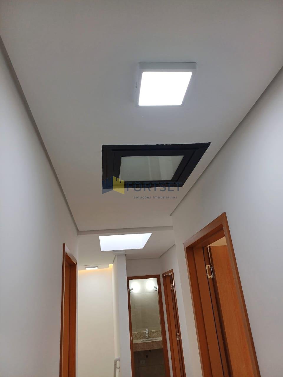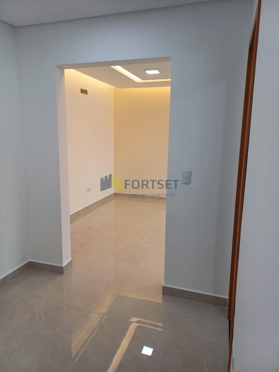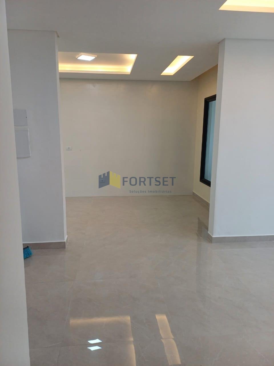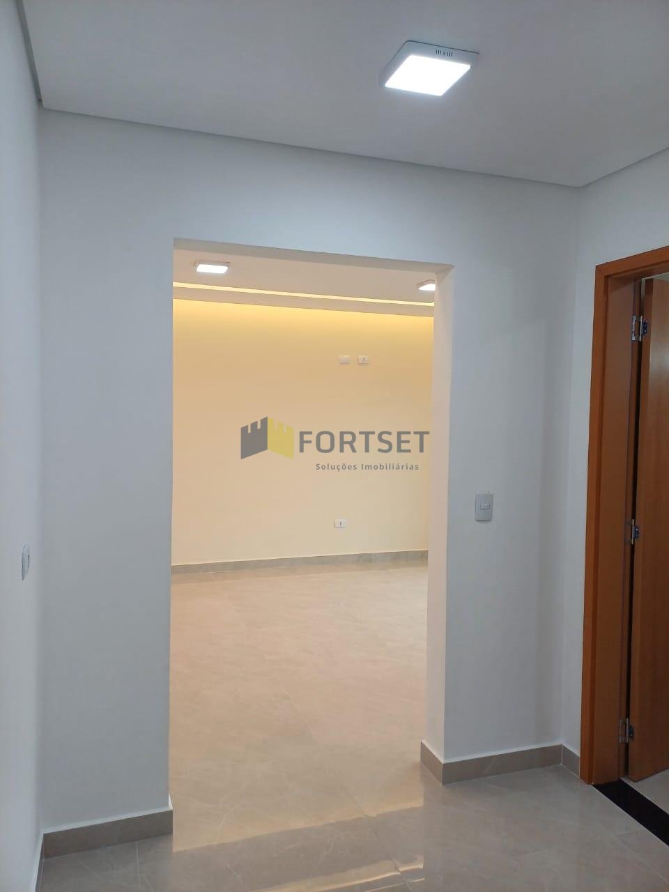 - Sala de estar, jantar e cozinha integradas com acabamento em gesso e iluminação embutida