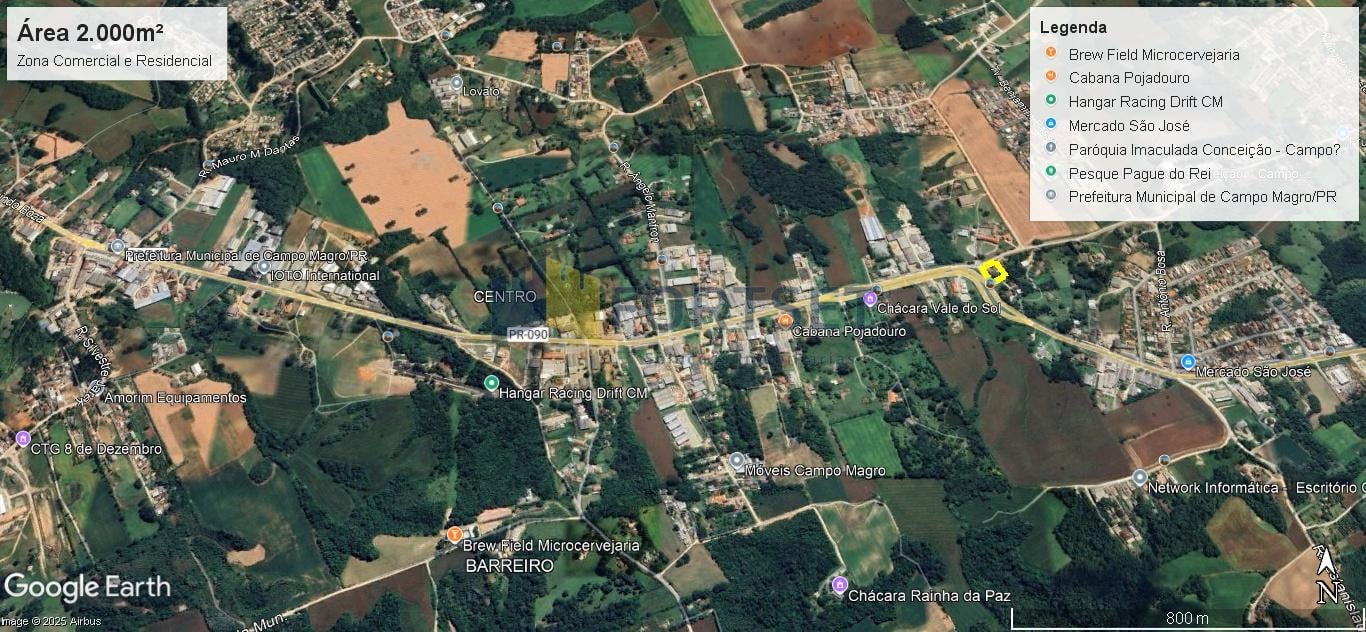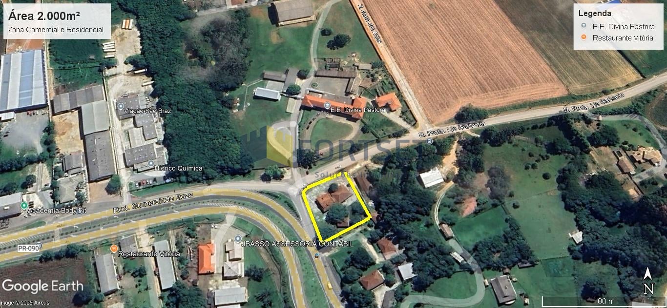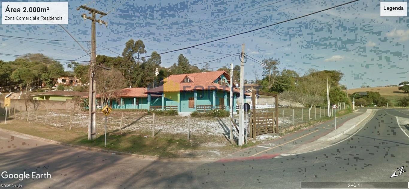 Terreno comercial / Residencial , bem na entrada da Cidade de Campo Magro na Rodovia Gumercindo Boza , 18460 de esquina com a rua Lia Gabarcio n. 10 , bem em frente ao Colégio Estadual Divina Pastora . Terreno com frente de 54,8 mts para Rodovia e contendo 2 casas de alvenaria , bem construídas em perfeito estado de conservação onde funcionava o restaurante " Benedita " . Tendo a área construída de 494,47m² e o Terreno com 2.935,61 m² de área total e 2.000m² de área liquida / privativa . Distante apenas 20Km do centro de Curitiba , seguindo por avenida de pista dupla até quase chegar no Imóvel .
